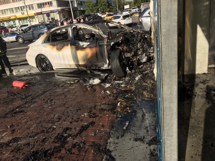 Мерседес подлетел на препятствии, слетел с дороги, въехал в опору пешеходного перехода и загорелся.