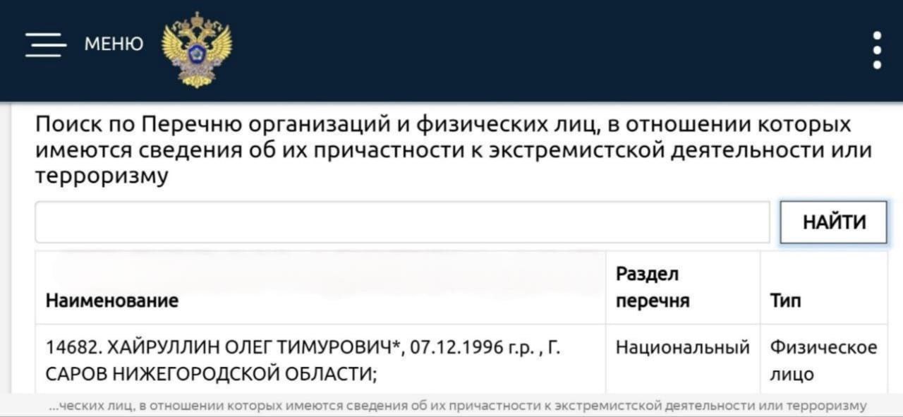 Саровчанин появился в списке террористов и экстремистов на портале Росфинмониторинга. 28-летний Олег Хайруллин из Сарова появился в перечне физических лиц, в отношении которых имеются сведения об их причастности к экстремистской деятельности или терроризму.