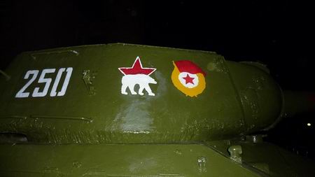 На самом же деле белый медведь на фоне красной звезды — отличительный знак 7-й гвардейской тяжёлой танковой бригады, что у советских танковых войск было редкостью. Бригада прославилась в частности тем, что участвовала в штурме Берлина.