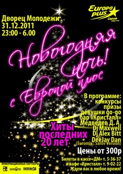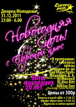 «Европа плюс Саров» напоминает, что с сегодняшних 23.00 до завтрашних 6.00 во «Дворце молодежи» будет пузыриться шампанским главная новогодняя вечеринка от радиостанции номер один в России.