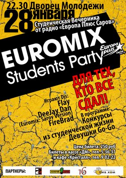 Поэтому все студентам и сочувствующим следуют обратить внимание на 28 января. Именно в этот день, в 22.30 стартует «Euromix Student Party» от радиостанции номер один в России.
