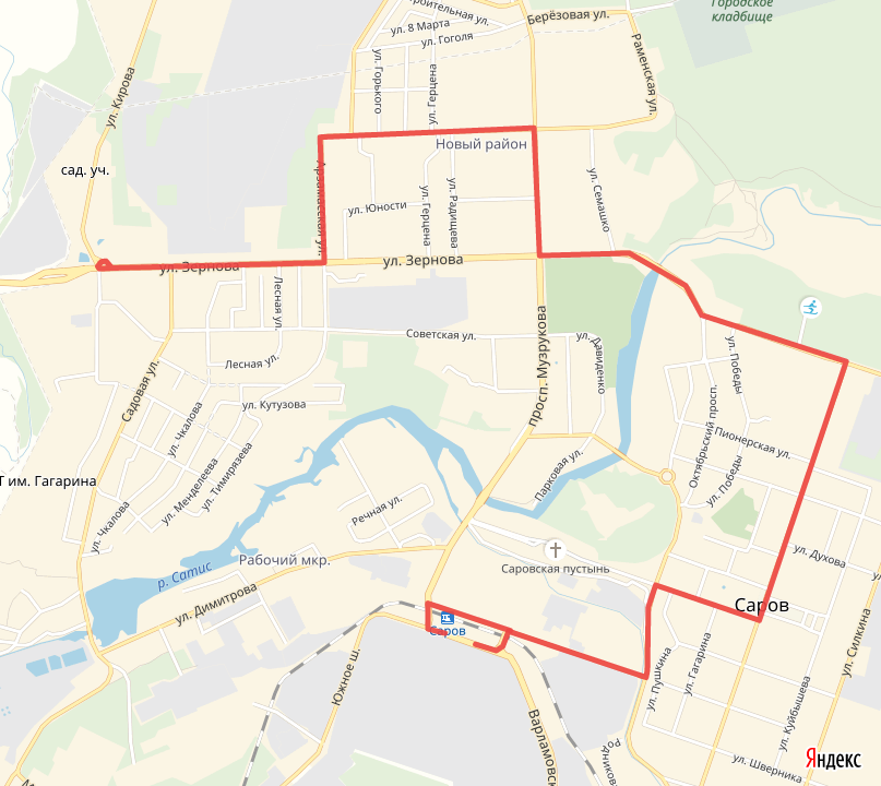 Остановки: ул. Мостовая — ул. Дорожная — Балыково — КПП-3 — ул. Зернова — ул. Арзамасская — ул. Маяковского — м-н «Нижегородский» — ул. Курчатова КБО — Бани Центральные — Больничный городок — Школа искусств — Лыжная база — школа 20 — Вечный огонь — Дворец творчества школьников — Ресторан Колокол — м-н «Магнит» — Дом торговли — ул. Ключевая — ул. Бессарабенко — Хлебозавод — м-н «Заказы» — Парк АСС — Завод № 1 — Хлебозавод — ул. Бессарабенко — ул. Ключевая — ОБЦ — Дом торговли — Ателье Элегант — Лицей № 3 — м-н «Дружба» — Вечный огонь — Школа 20 — Лыжная база — Больничный городок — Бани «Центральные» — КБО ул. Курчатова — м-н «Нижегородский» — ул. Маяковского — ул. Арзамасская — ул. Зернова — КПП-3 — Кирпичный завод — Балыково — ул. Дорожная — ул. Мостовая.