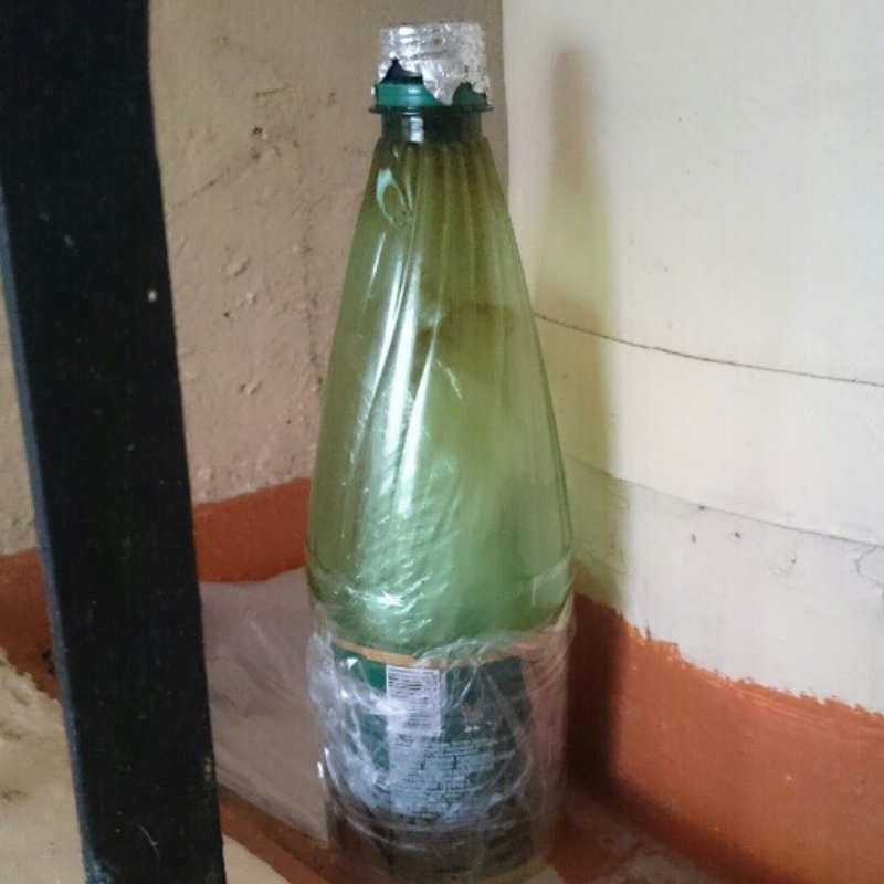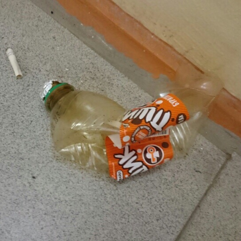 На фото — целая коллекция приспособлений, брошенная в подъезде. Весь модельный ряд изделий курильщиков травы, от самых примитивных до технически продвинутых средств расплавить свои мозги.