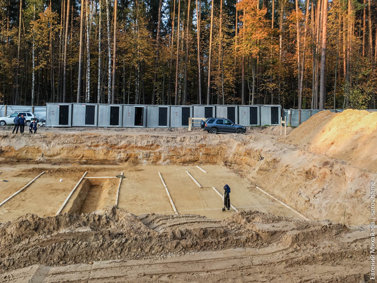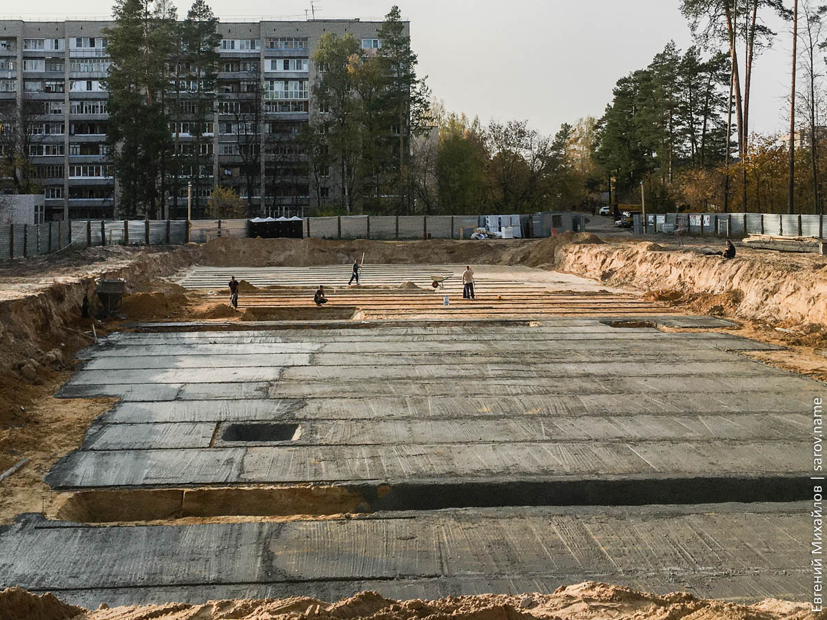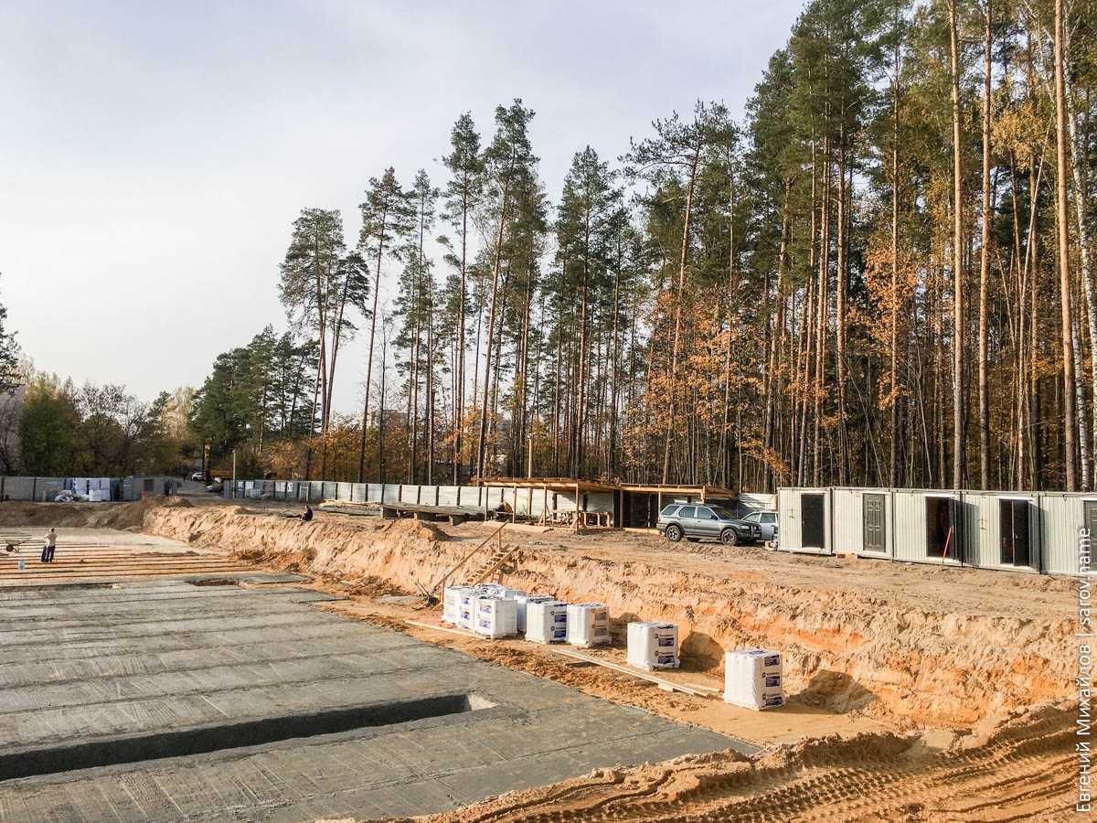 Полным ходом идёт строительство новой детской поликлиники — это на продолжении улицы Чапаева, в лесу. Какая-то интересная технология, я не очень понимаю, что они делают. На вид — намазывают бетон прямо на песок. Наверное, так и надо.