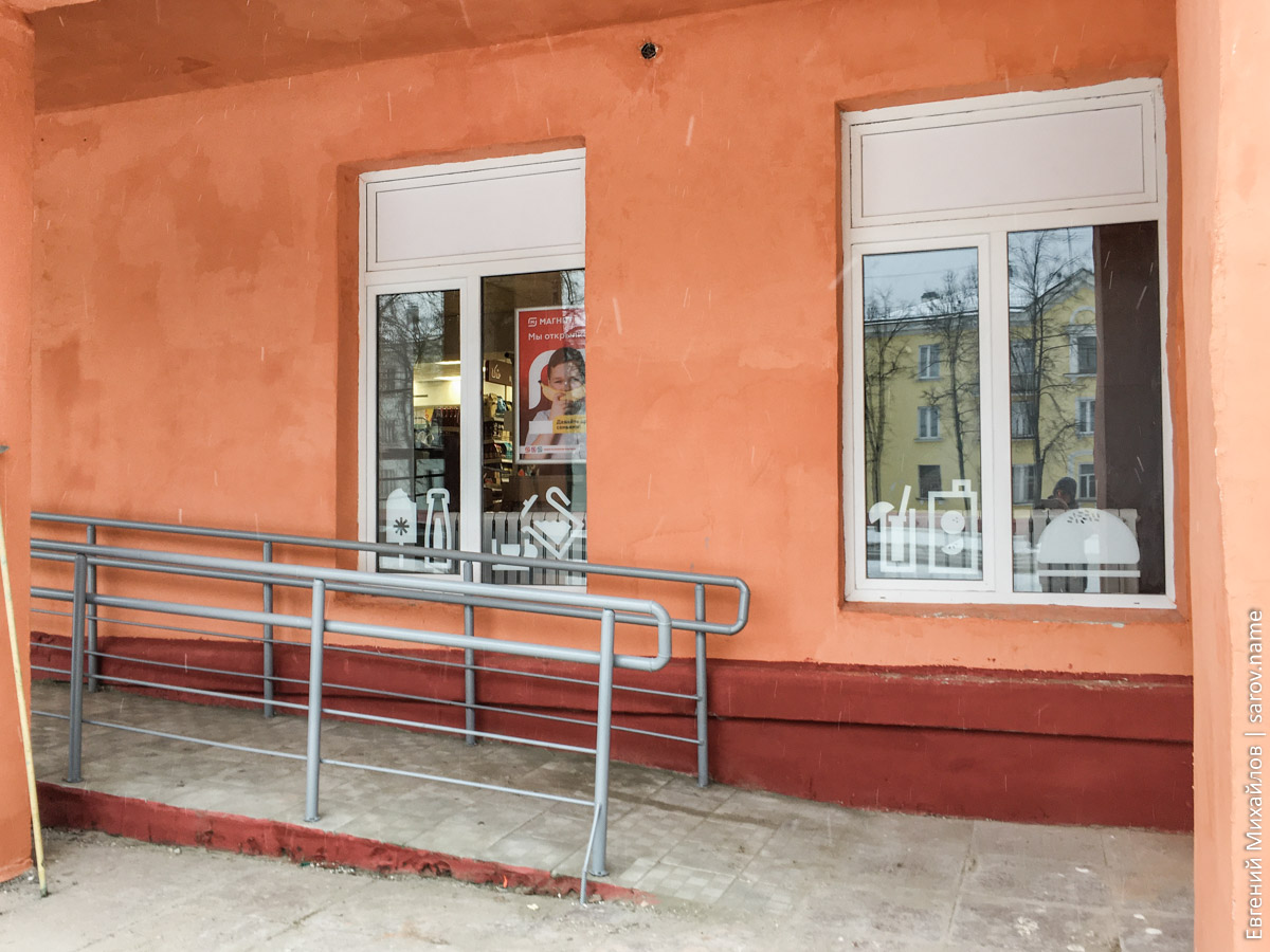 Разумеется, открытие такого магазина значит, что не самое плохое советское здание «украшено» поперёк здоровенной красной полосой и крупным белым названием.