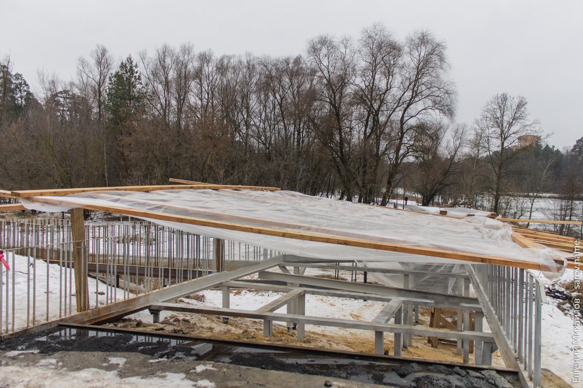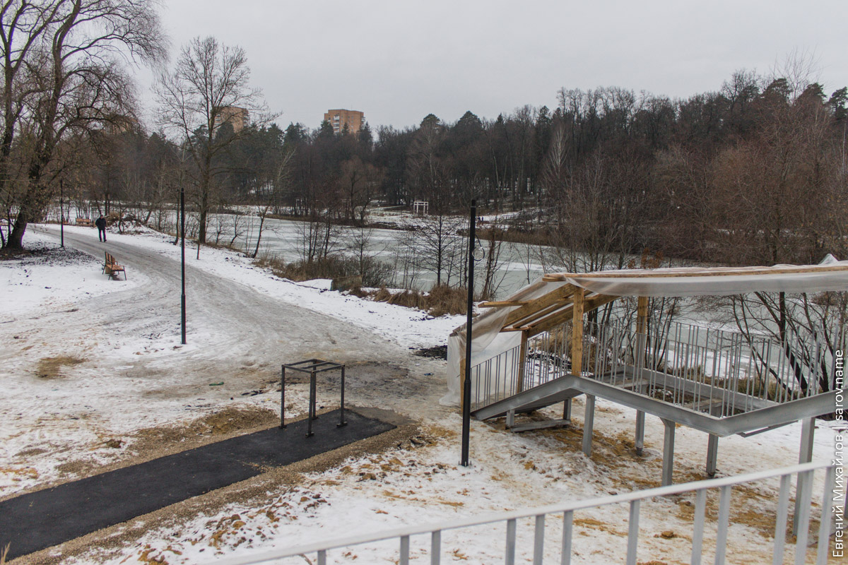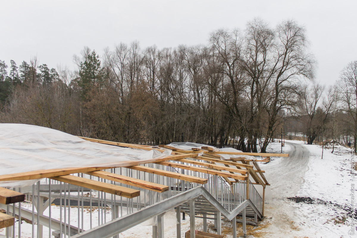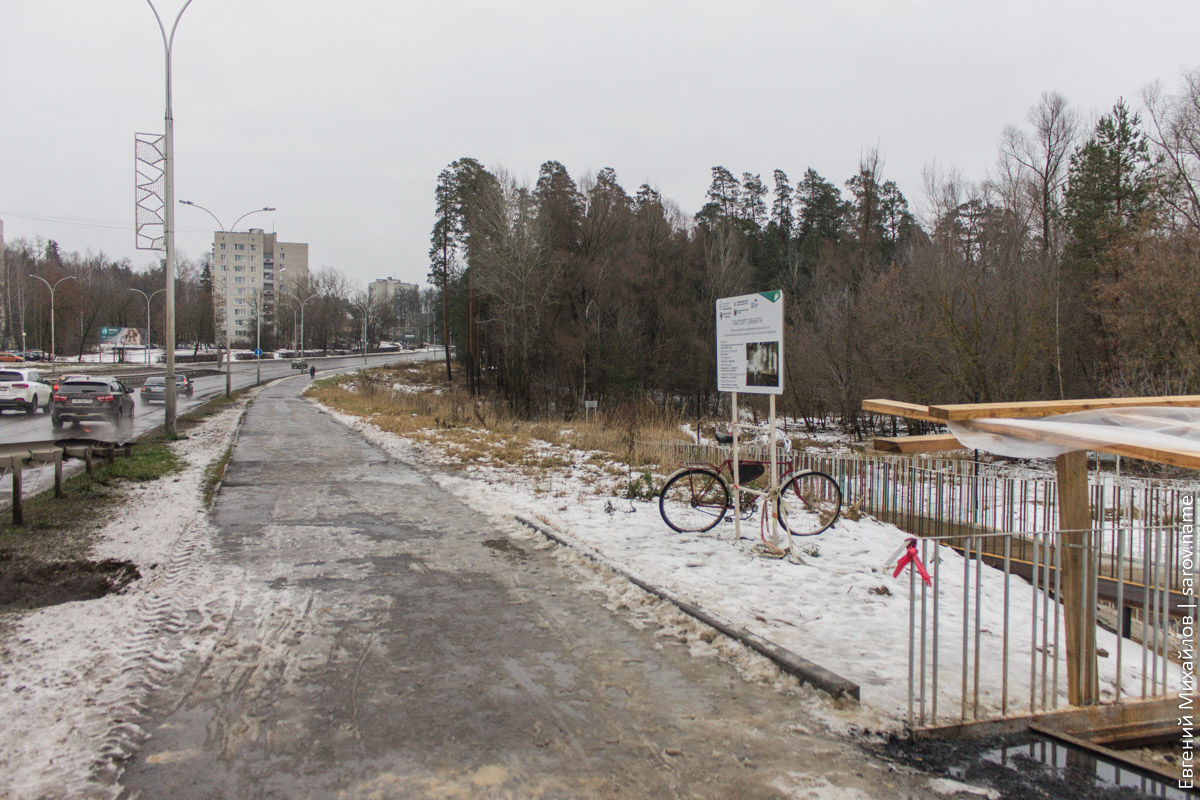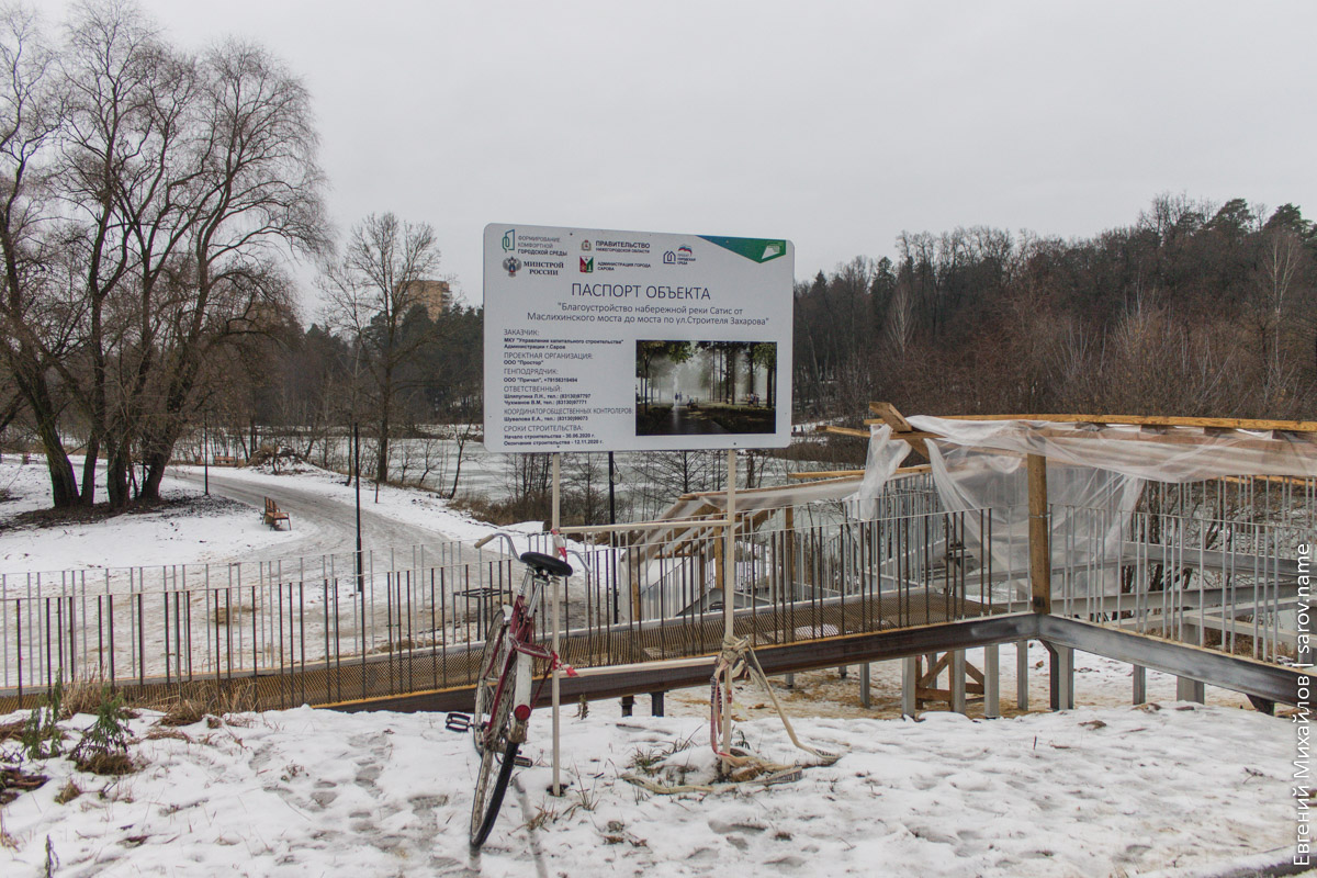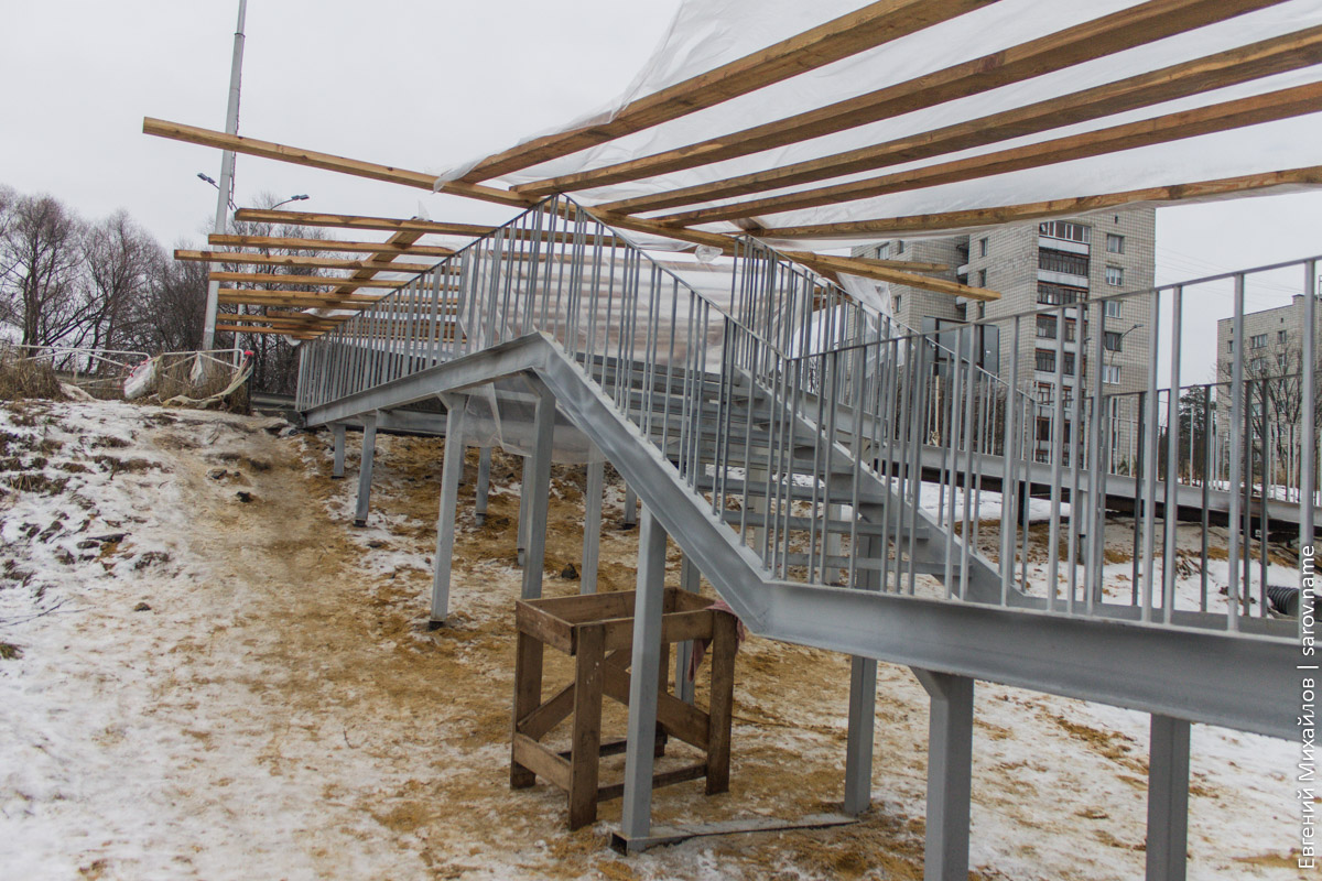 Несмотря на надпись на плакате, которая гласит, что окончание работ должно было быть 12 ноября, объект закончить не успели и впёрлись прямиком в зиму. Возле моста можно заценить продвижение строительства лестницы и пандуса: