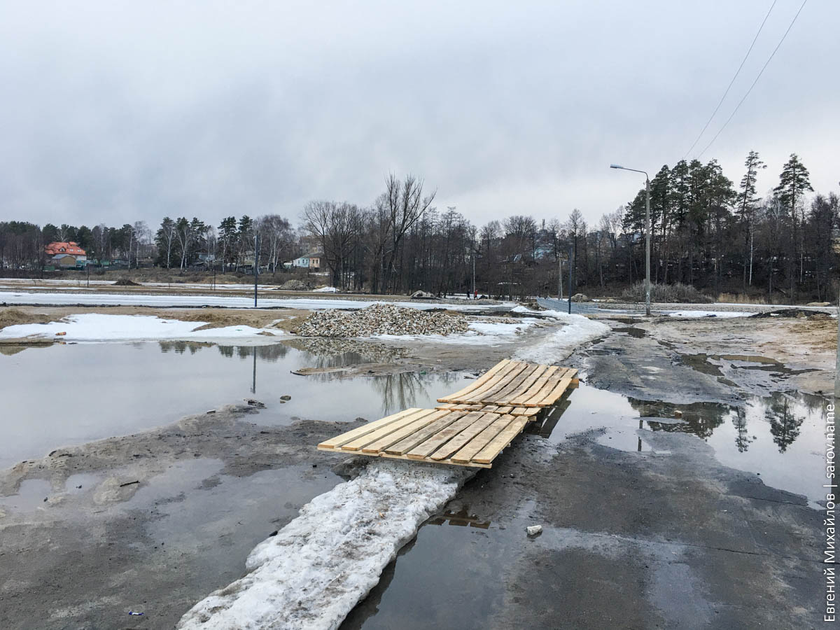 Пока что выходит, что весенний паводок доставляет больше всего проблем тем, кто ходит туда-сюда по понтонному мосту через Сатис. Сперва там со стороны улицы Димитрова образовалась огромная непроходимая лужа, для перехода через которую кто-то положил деревянные мостки: