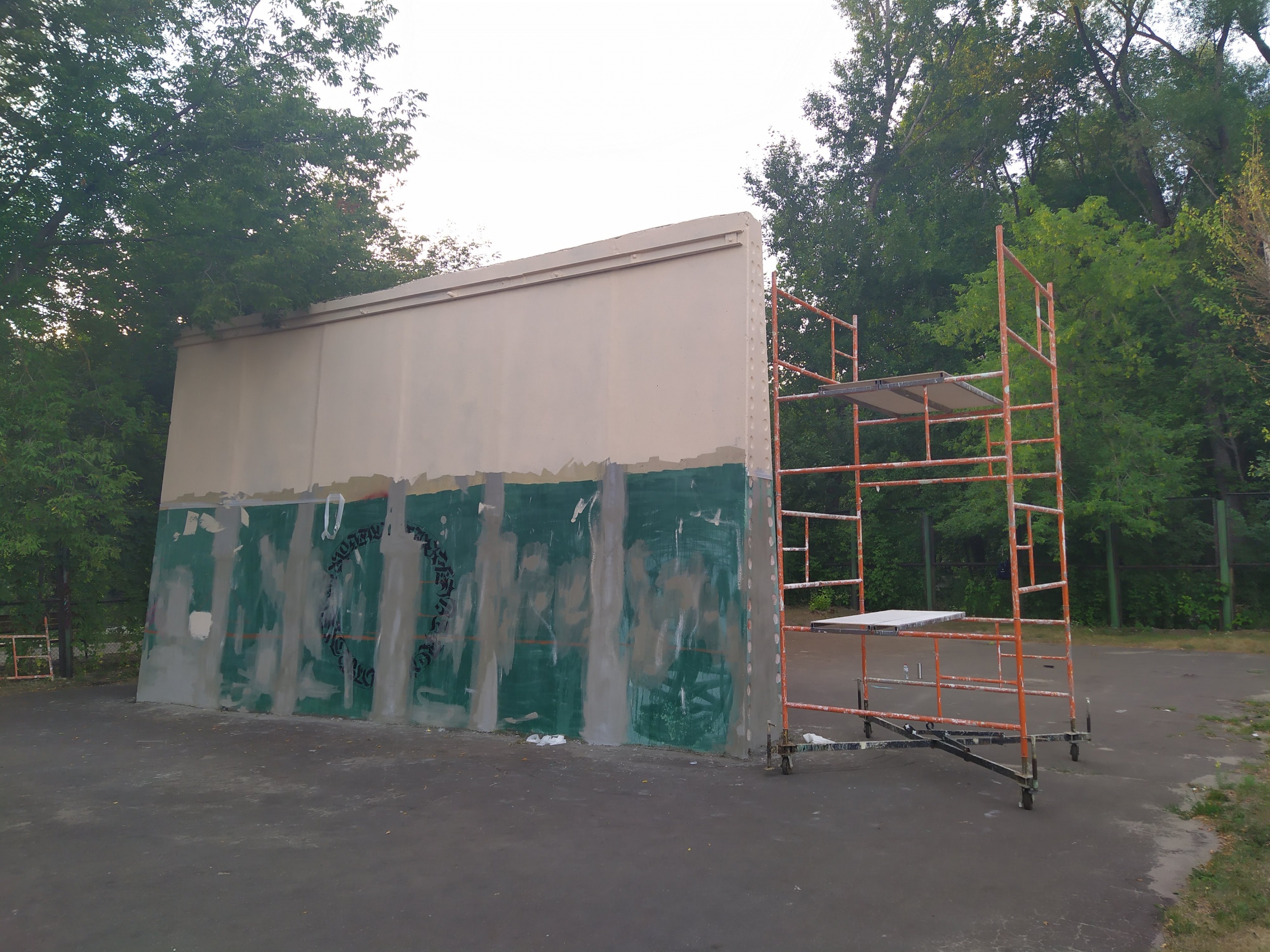 А 9 июня согласно своему графику снова отправился туда ходить по кругу спортивной ходьбой. И что я вижу?! Стенку эту шпатлюют и красят.