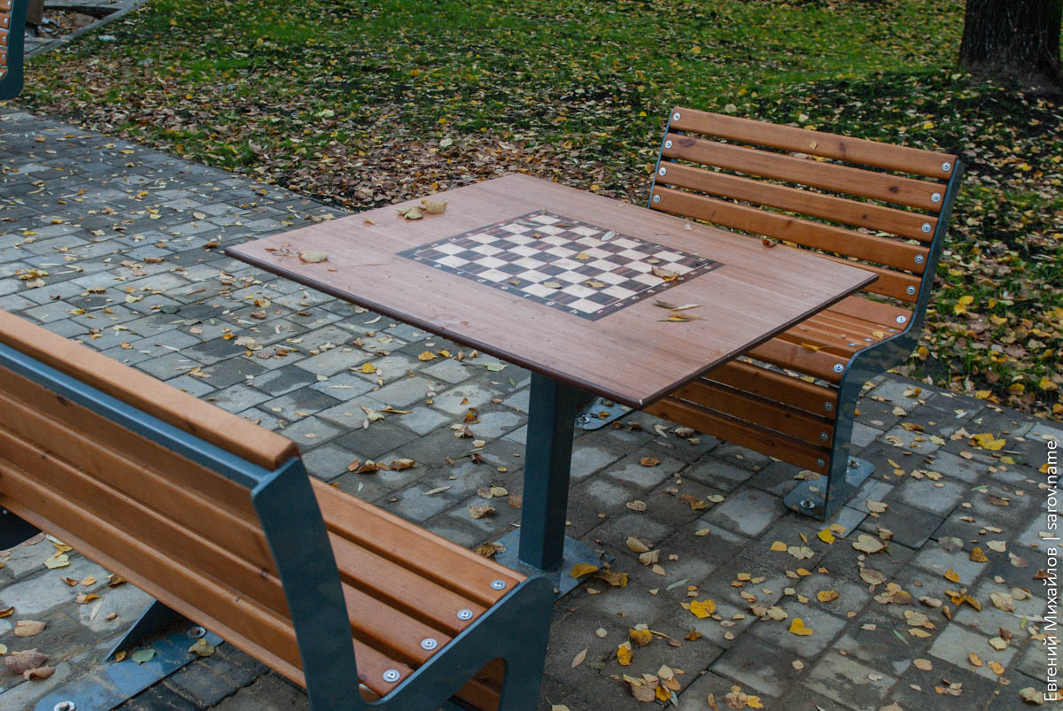 Вкратце: есть площадка для собак, можно посидеть, поиграть в теннис и шахматы. Стоит олень. Некоторые лавочки уже разрушаются (скорее всего, кто-то начал тырить деревяшки); один из столов для тенниса повреждён. Олень на первый взгляд цел.