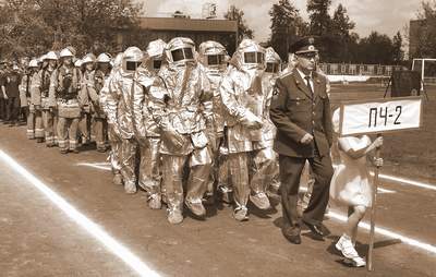 Самой зрелищной частью мероприятия, разумеется, была демонстрация возможностей пожарной техники и неисчерпаемых человеческих ресурсов. Забраться на пожарную вышку по веревке и спрыгнуть с неё на растянутый внизу батут, пройти сквозь огонь и найти букет цветов под толщей пожарной пены — это может не каждый.