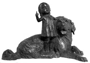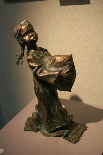 А вот в скульптурах — детские образы, забавные жизненные эпизоды. Меня особенно умилила композиция «Большие друзья» — веселая девочка с лежащей рядом огромной лохматой собакой. У самого Олега Закоморного двое детей, так что ему ничего не приходится выдумывать — есть с кого писать и лепить.
