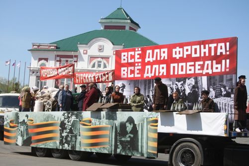 Участникам поездки особенно повезло: они попали на репетицию грядущего парада Победы. Зрелище было поистине грандиозное: колонны машин с длинными прицепами, на которых представлена вся история Великой Отечественной войны, история Победы. Здесь были театрализованные экспозиции блокады Ленинграда, защиты Брестской крепости, Севастополя, Москвы, Сталинградской битвы и Курской дуги, были показаны страшные страницы воспоминаний узников концлагерей…