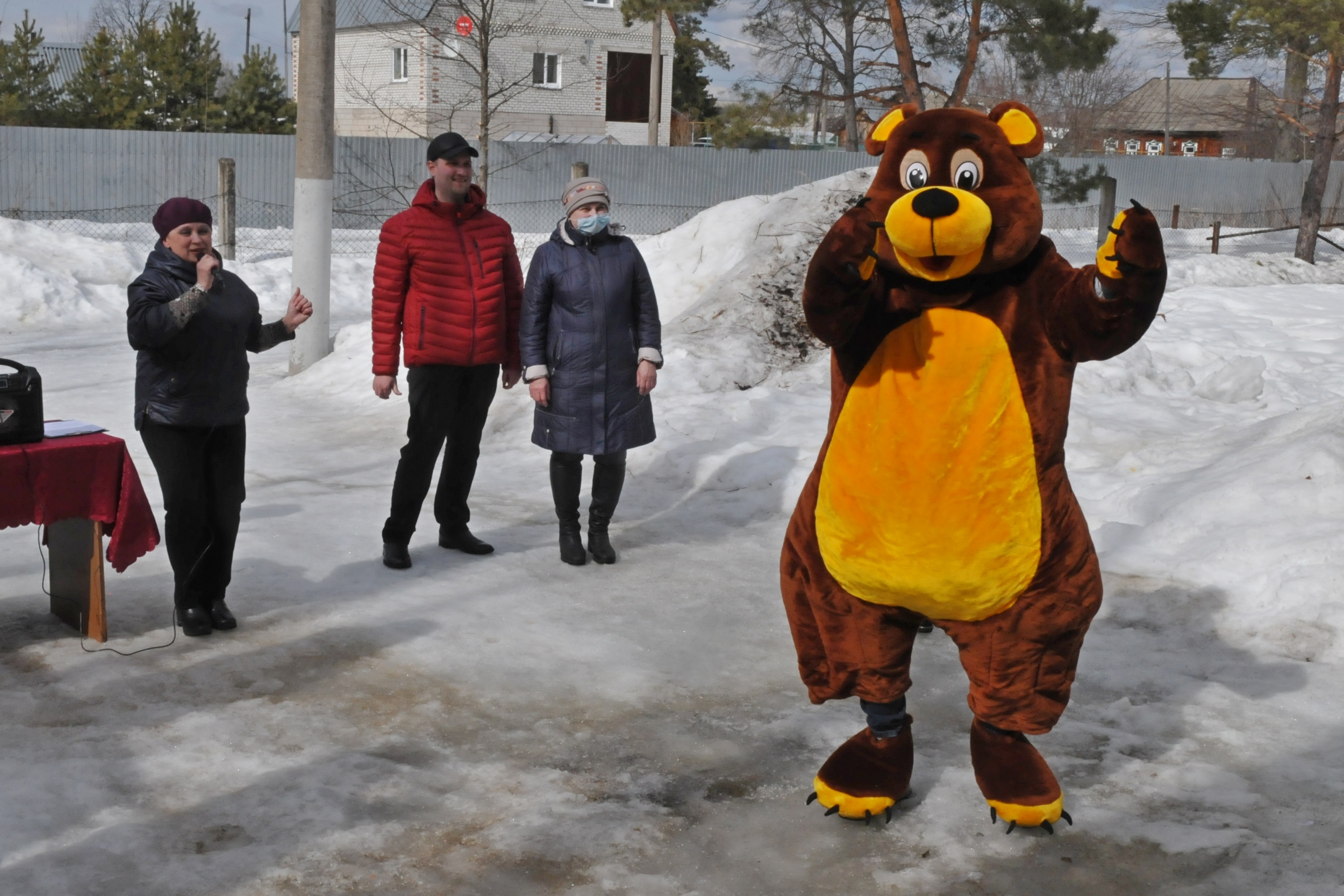 Потом из леса «после зимней спячки» вышел Мишка (ростовая кукла — А. Анисимов). Он пригласил всех присутствующих на зажигательную дискотеку в честь прихода Весны. Дети с сияющими лицами топали ножками, махали ручками, повторяя движения за гостями!