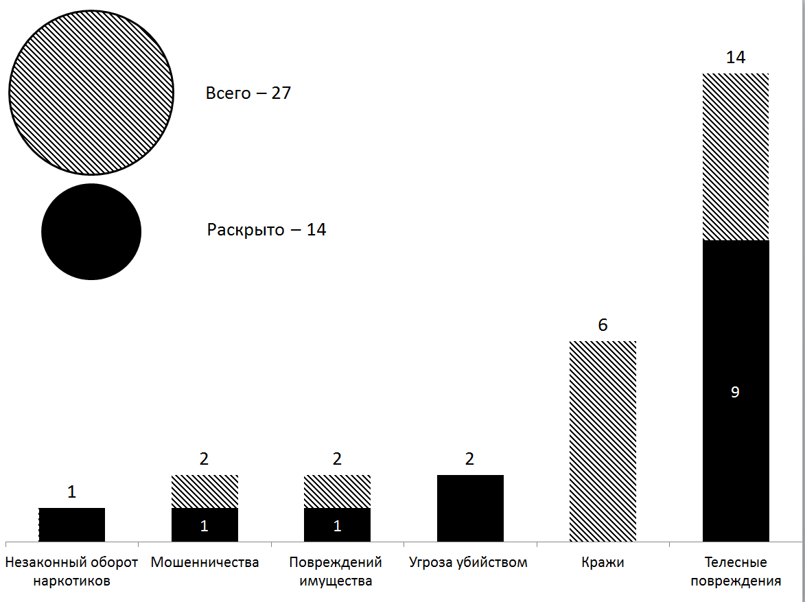 Зарегистрировано 27/14 обращений о происшествиях и преступлениях. Краж — 6/0, с садовых участков — 1/0, в общественных местах — 2/0, прочих — 3/0. Мошенничеств — 2/1. Незаконный оборот наркотиков — 1/1. Угроз убийством — 2/2. Суицид — 1. Причинений телесных повреждений — 14/9, на бытовой почве — 4/4, из хулиганских побуждений — 10/5. Повреждений имущества — 2/1. Административных правонарушений — 742. В сфере БДД — 548. ДТП — 16 (один водитель скрылся). Управляли транспортными средствами в состоянии алкогольного или наркотического опьянения либо отказались от медицинского освидетельствования — 3. Превышений скорости — 8. Нарушений требований дорожных знаков и разметки — 161. Тонировка — 22. Переходов дороги в неустановленном месте — 13. Нарушений паспортных правил — 19. Мелких хулиганств — 16. Появлений в общественных местах в состоянии алкогольного опьянения — 23, в наркотического — 8. Распитий спиртных напитков в общественных местах — 111.