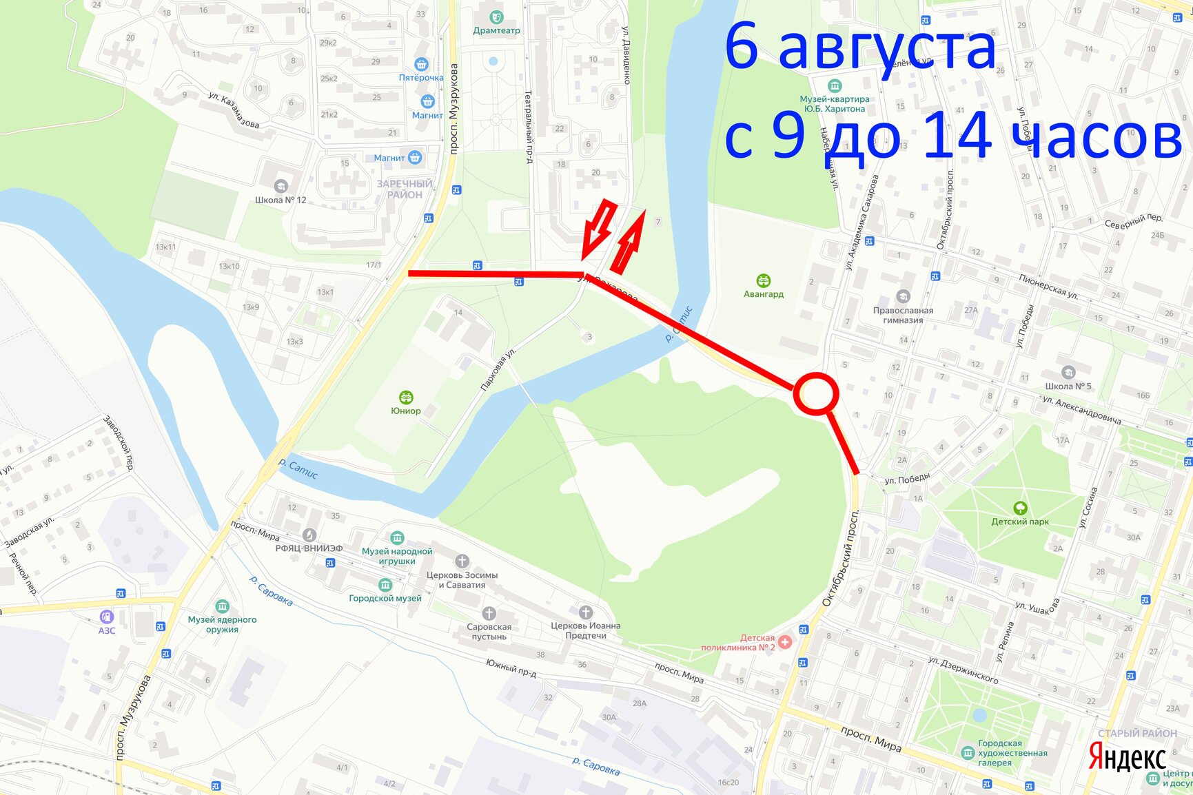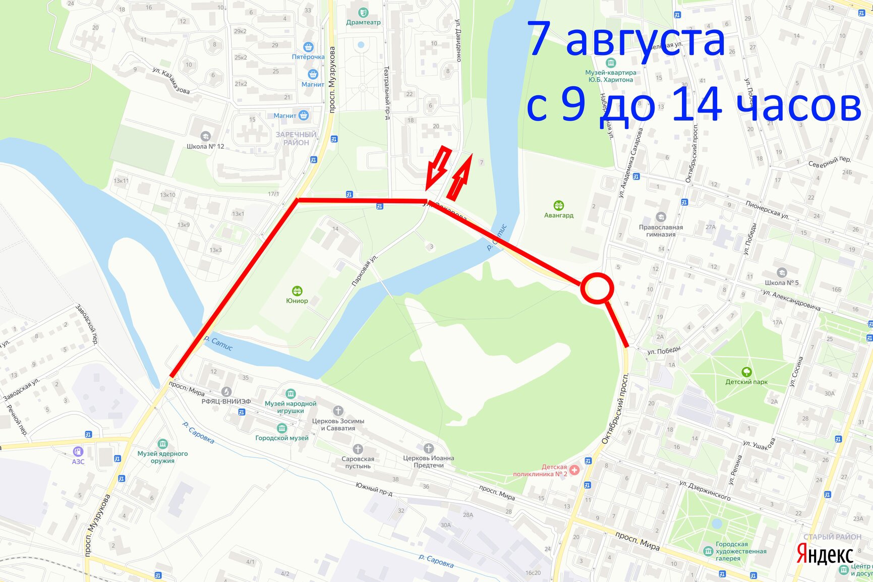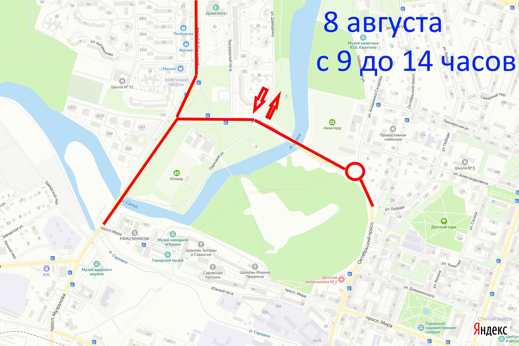 - 8 августа с 9 до 14 часов по пр. Музрукова (от пересечения с ул. Советской до пересечения с пр. Мира), а также по ул. Строителя Захарова (от пересечения с пр. Музрукова, включая круговое движение на ул. Ак. Сахарова, и до пересечения ул. Ак. Сахарова с пр. Октябрьский)