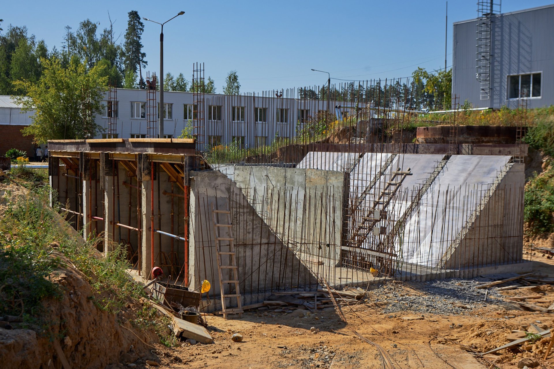 На территории наших очистных идёт строительство здания № 62 (аэрируемой двухсекционной песколовки). Ведутся бетонные работы, уже залита монолитная плита, сделаны конструкции стен сооружения.