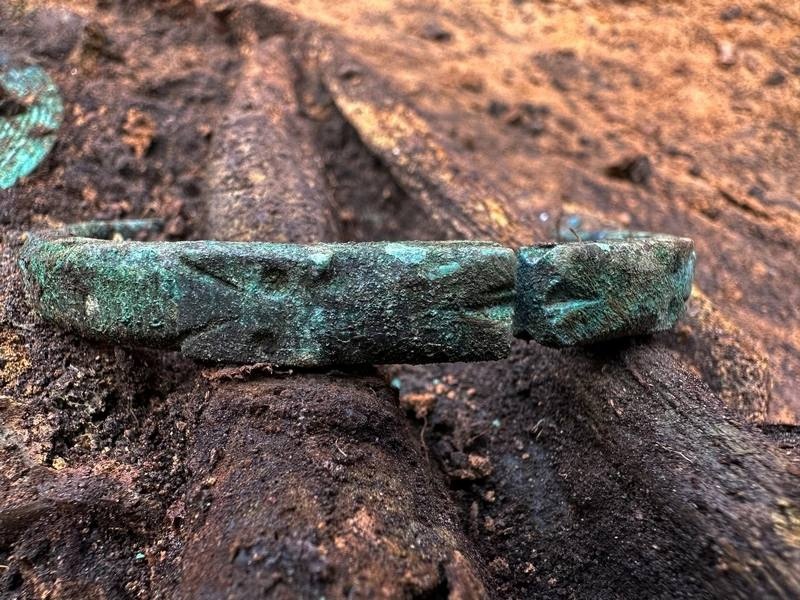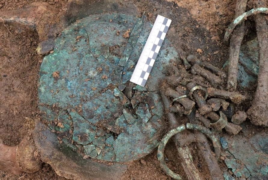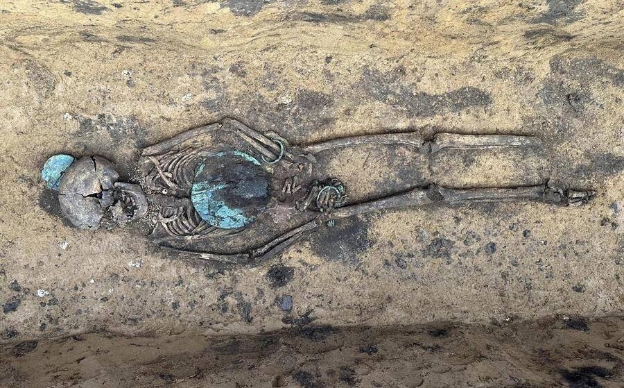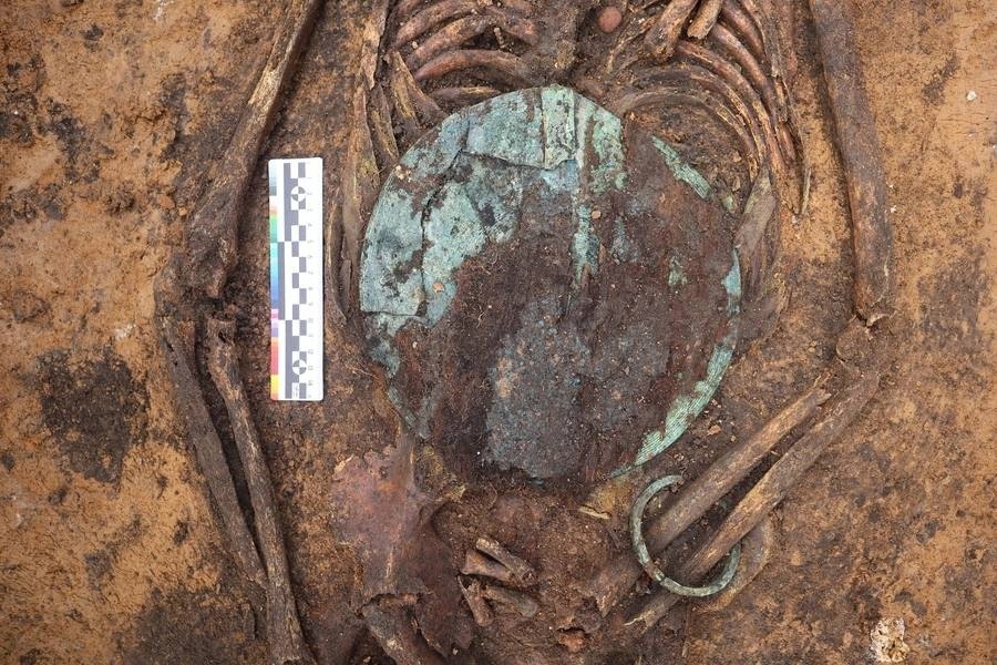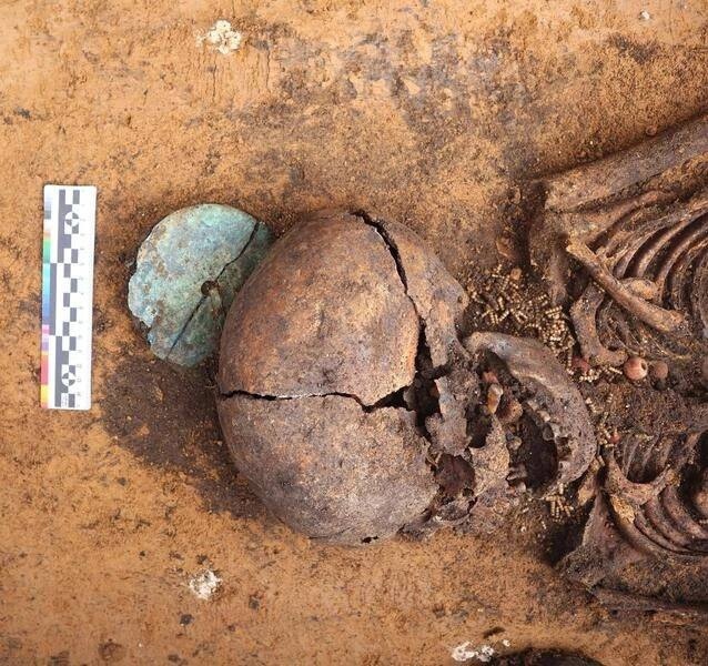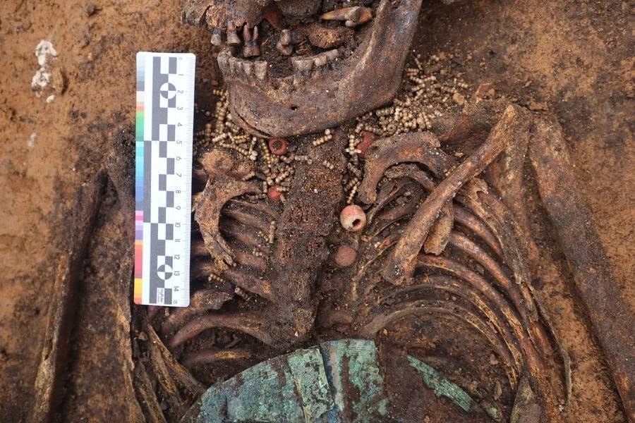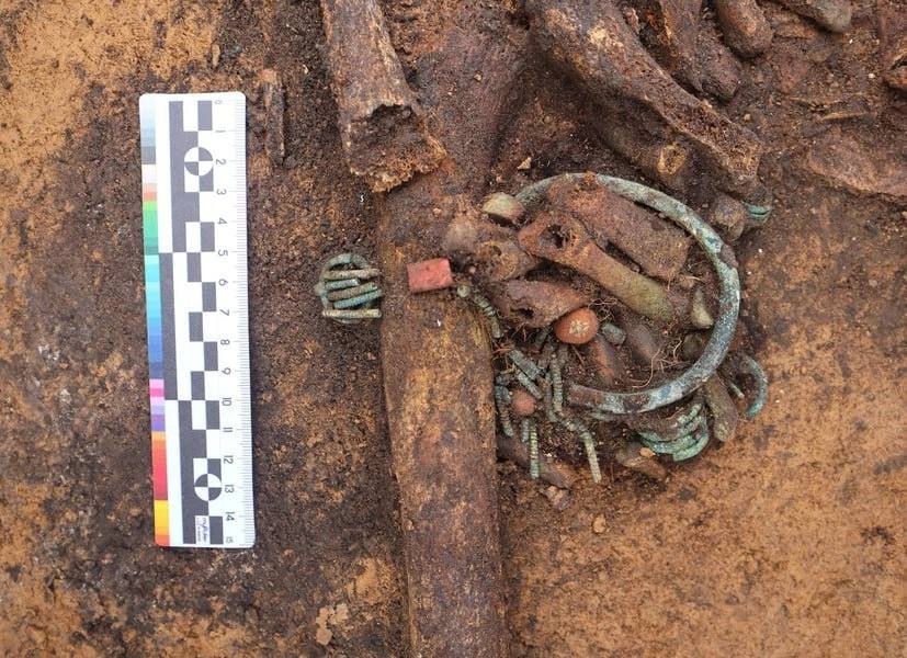 Найденные в могильнике предметы не имеют прямых аналогов и являются уникальными. На фото — женская могила, тело усопшей богато украшено бусами, круглыми бляхами за головой, на груди и в районе таза. Это характерный почерк мордовских захоронений.