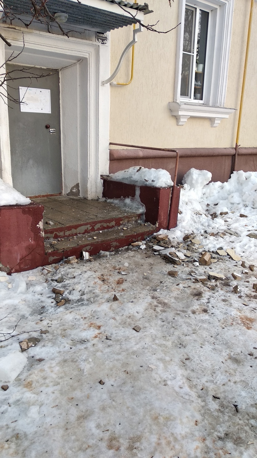 Из-за протекания крыши обвалилась штукатурка над крыльцом подъезда на улице Вити Коробкова, дом 4, чудом пока никто не пострадал.